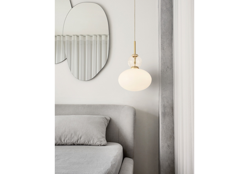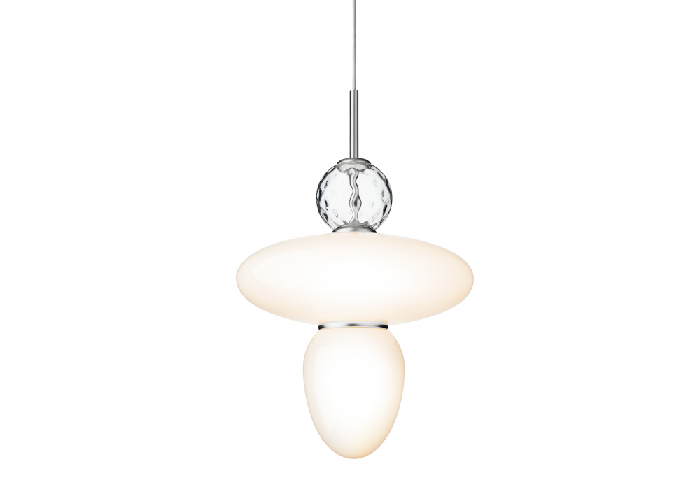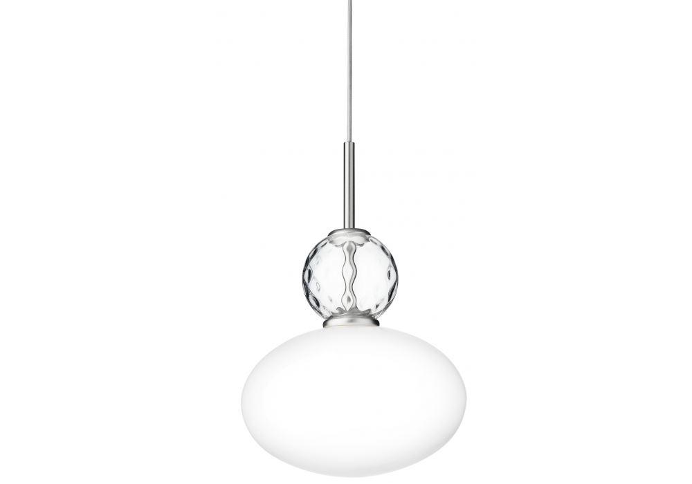 Rizzatto firmata da Paolo Rizzatto per Nuura è una lampada a sospensione con paralume in vetro soffiato opale e anelli in metallo satinato. Tra la tige e l'anello metallico è presente una sfera in vetro trasparente.