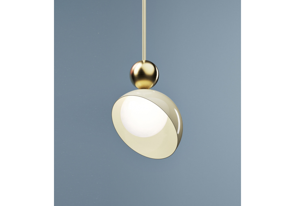 Aurora firmata da Virginia Cei per Italamp è una lampada a sospensione realizzata in metallo verniciato e sfera centrale in finitura oro chiaro spazzolato. Il diffusore è in vetro bianco.