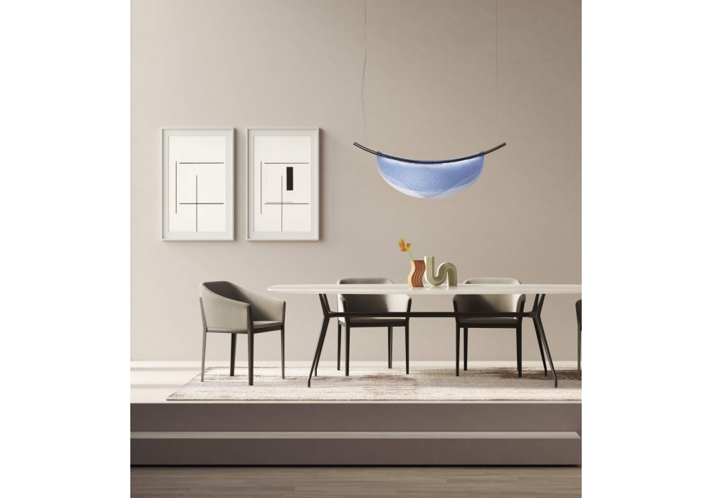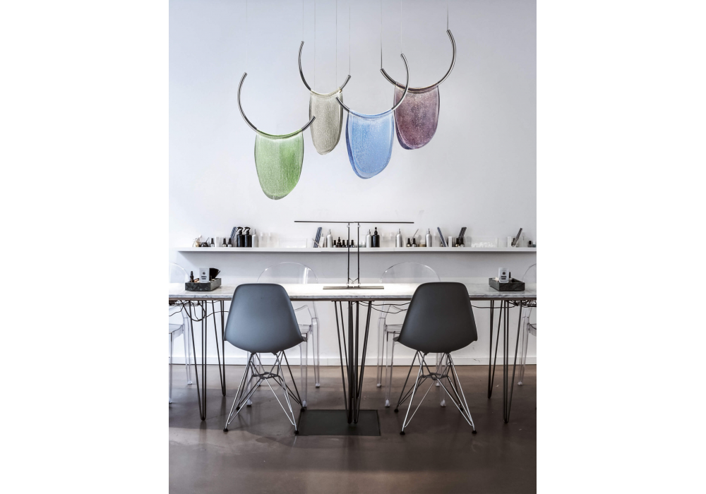 Dalì firmata da Nava+ Arosio Studio per Italamp è una lampada a sospensione con struttura in metallo canna di fucile diffusori in vetro termoformato colorato.