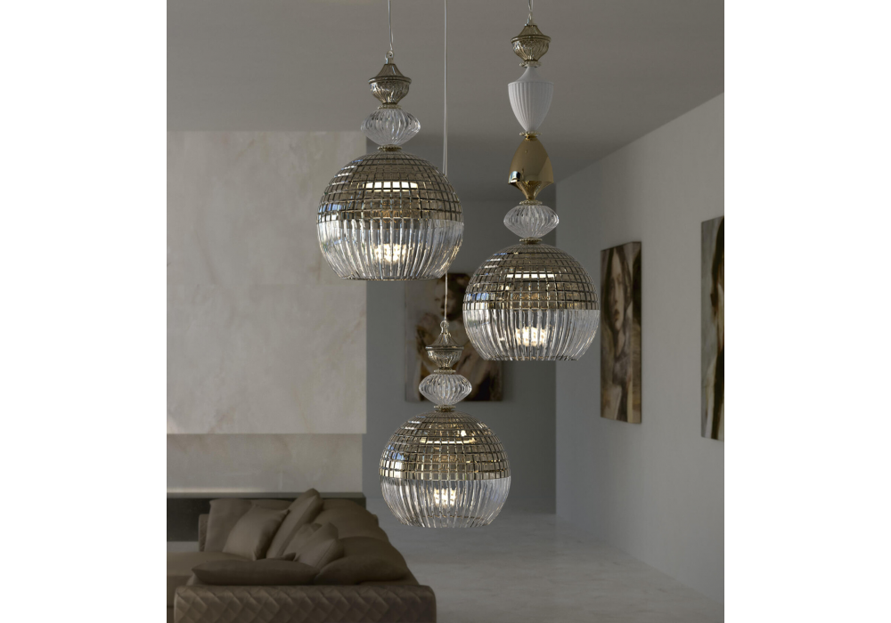 Amelie firmata e prodotta da Italamp è una lampada a sospensione con struttura in metallo. Diffusore eparticolari in cristallo intagliato trasparente e teak.
