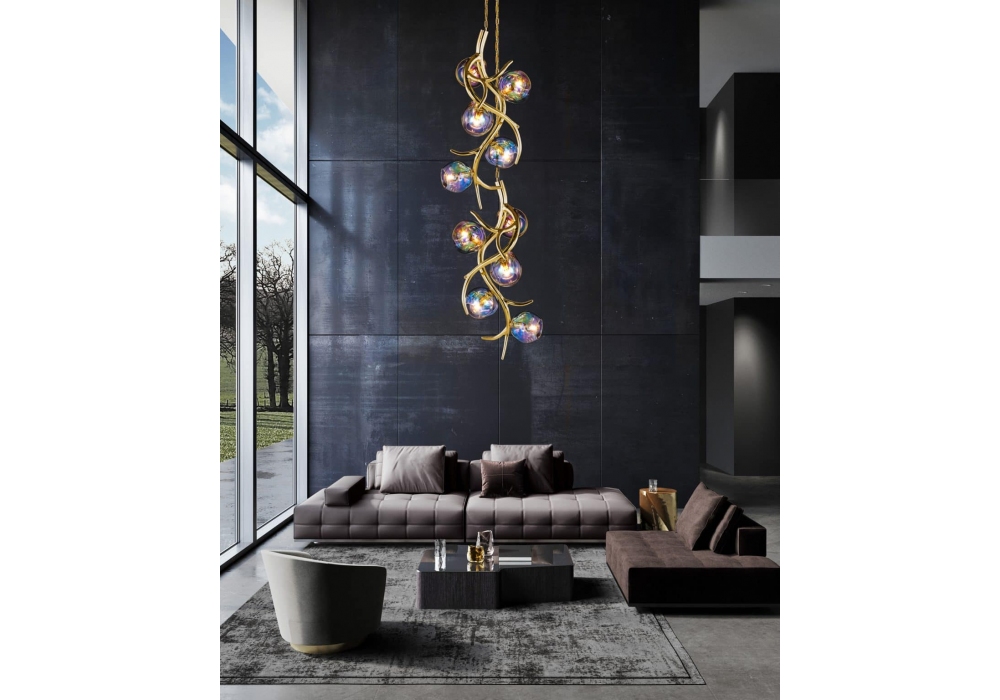Ersa Vertical firmata da William Brand per Brand Van Egmond è una lampada a sospensione realizzata con struttura in metallo e diffusori in vetro iridescente. Disponibile in diverse finiture e dimensioni. Su richiesta, le sfere si possono realizzare in bronzo traslucido o in vetro trasparente.