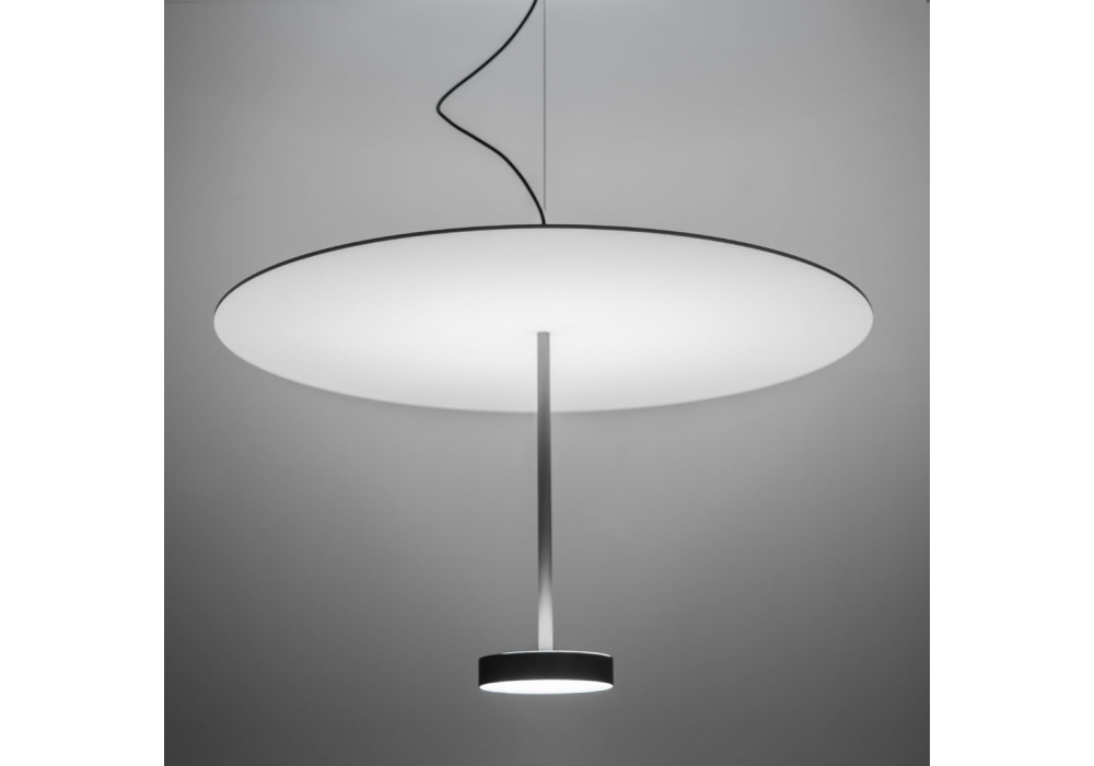 Servoluce firmata da Park Associati per Firmamento Milano è una lampada a sospensione a luce diretta e indiretta realizzata con struttura in alluminio verniciato bianco e stelo in ottone.