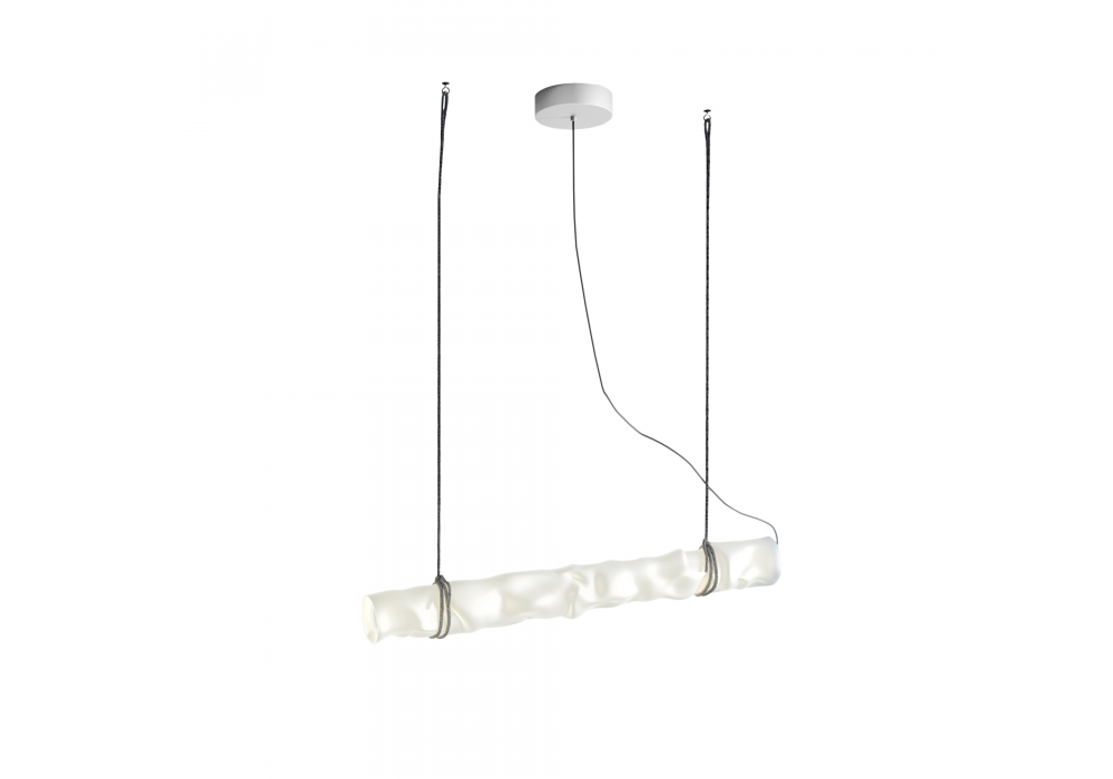 Baggy Horizontal firmata da Paola Navone per Contardi è una lampada a sospensione con corpo cilindrico irregolare in policarbonato bisatinato e corda di sospensione in tessuto bianca e grigia. La sorgente luminosa è di tipo Strip LED con sistema di dimmerabilita. Baggy Horizontal è disponibile in differenti modelli, lunghezza di corda di sospensione e versioni di dimmerabilità.