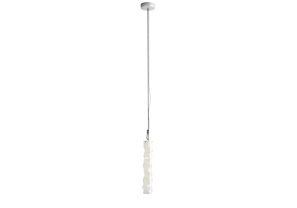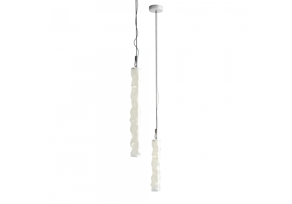 Baggy Vertical firmata da Paola Navone per Contardi è una lampada a sospensione con corpo cilindrico irregolare in policarbonato bisatinato e corda di sospensione in tessuto bianca e grigia. La sorgente luminosa è di tipo Strip LED con sistema di dimmerabilita. Baggy Vertical è disponibile in differenti modelli, lunghezza di corda di sospensione e versioni di dimmerabilità.