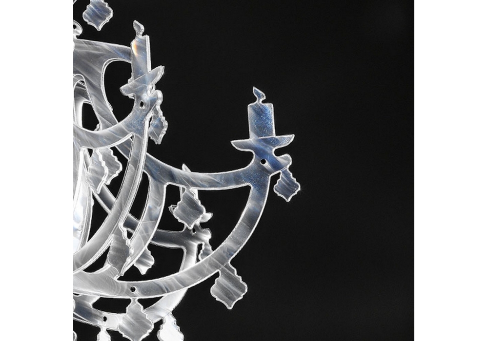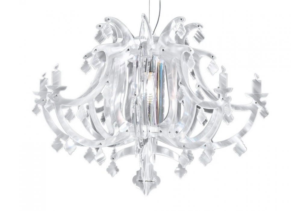 Ginetta Prisma firmata da Nigel Coates per Slamp è una lampada a sospensione ad 8 bracci interamente realizzata in Lentiflex®. Le sorgenti luminose adottate sono di tipo LED a filamento dimmerabili.