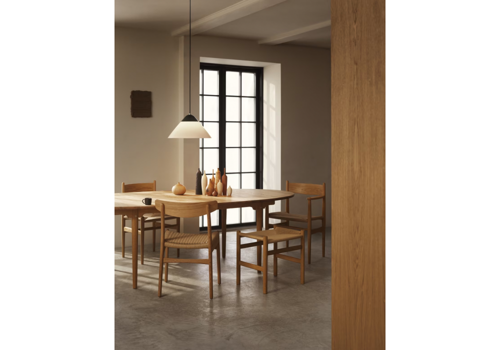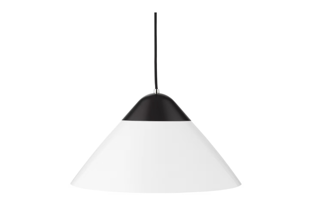 HJW38 Opala Pendant Mini firmata da Hans J. Wegner per Carl Hansen & Søn è una lampada a sospensione con paralume asimmetrico realizzato in acrilico opalino e alluminio verniciato in finitura bianca o nera.