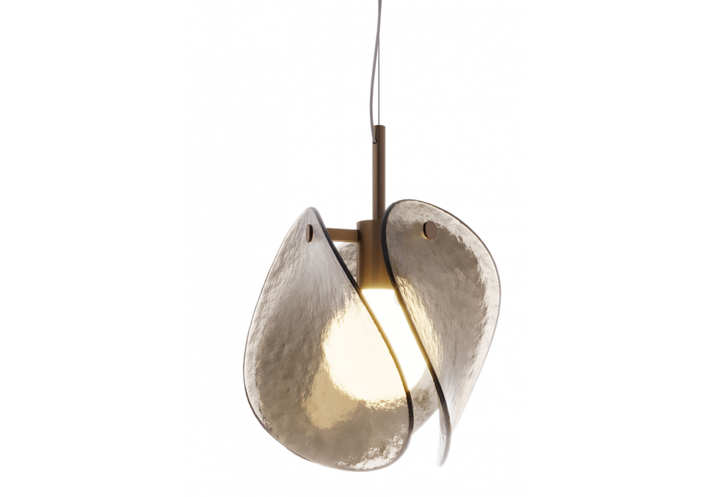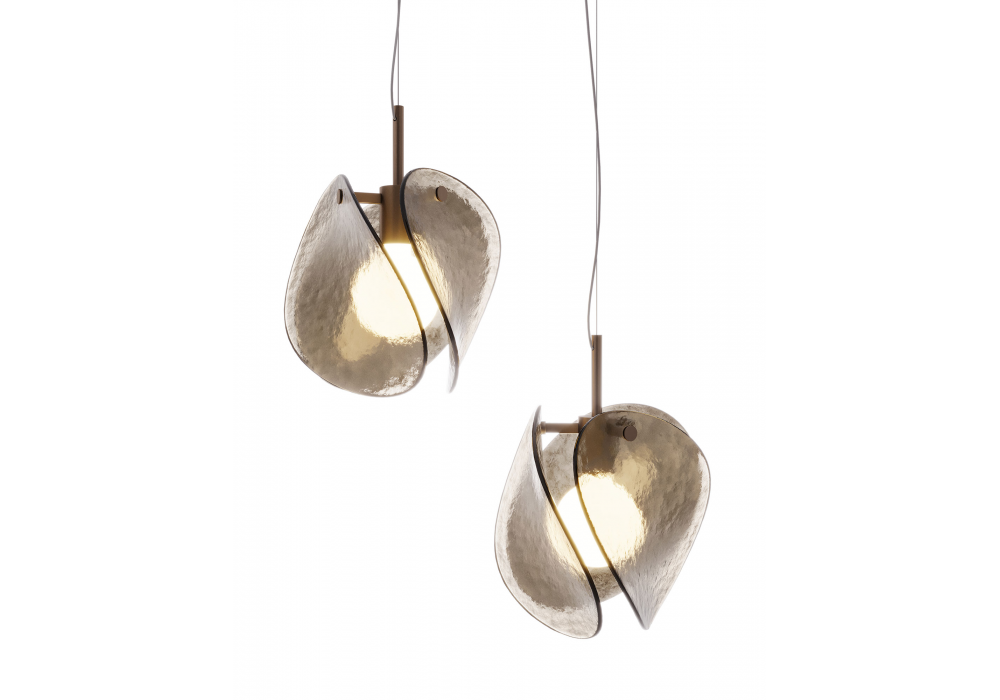 Tau firmata da Ryosuke Fukusada è una ampada a sospensione con struttura in metallo in finitura ottone brunito. Diffusore decorativo composto da tre elementi in vetro fumè o bronzo fuso a gran fuoco.