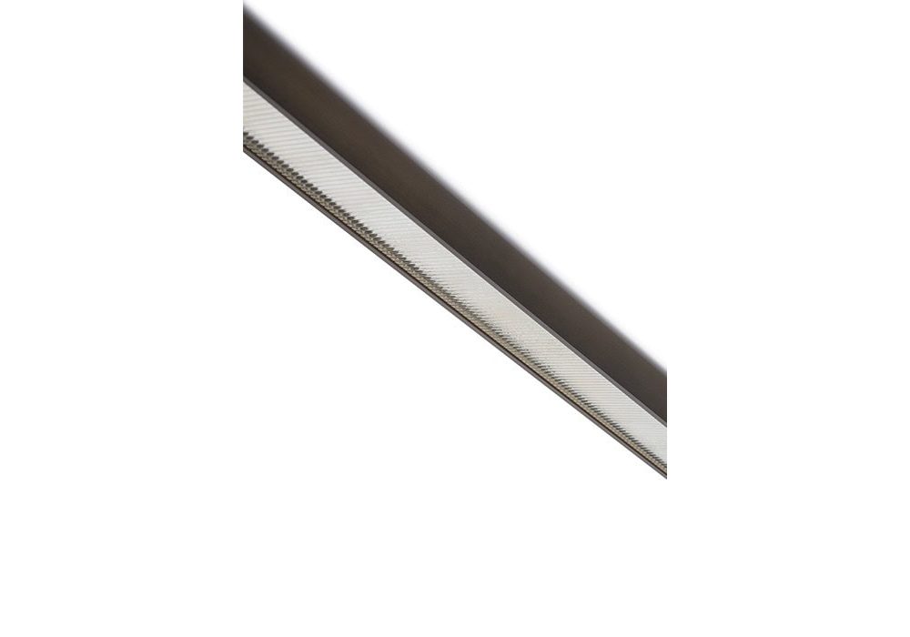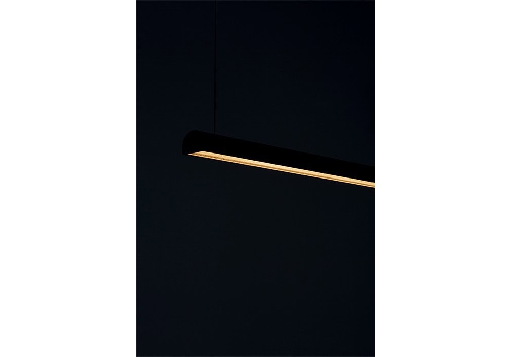 Cut Back Linear firmata da David Lopez Quincoces per DePadova è una lampada a sospensione con struttura in alluminio verniciato bronzo satinato e diffusore in vetro trasparente millerighe. Rosone in metallo coordinato con alimentatore e dimmer integrati (PUSH / 0-10 / DALI / CUT PHASE). Disponibile anche con controllo CASAMBI opzionale.