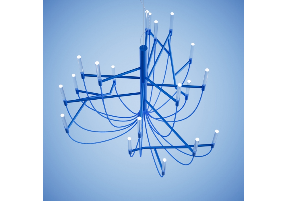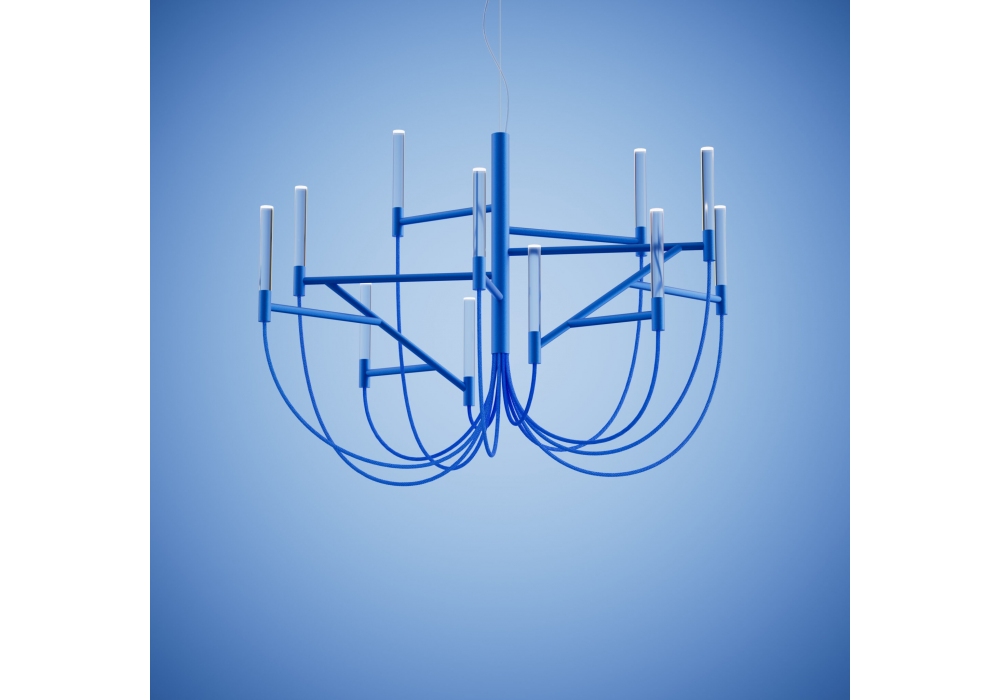 Allumette firmata da Franesca Lanzavecchia per Foscarini è una lampada a sospensione ispirata ai classici chandelier, presenta una struttura in metallo che si mescola con la morbidezza dei cavi tessili donando una forma quasi sculturea e asimmetrica.