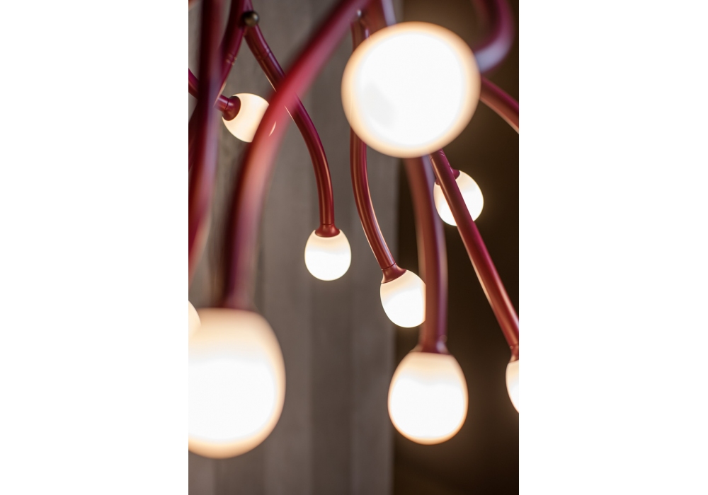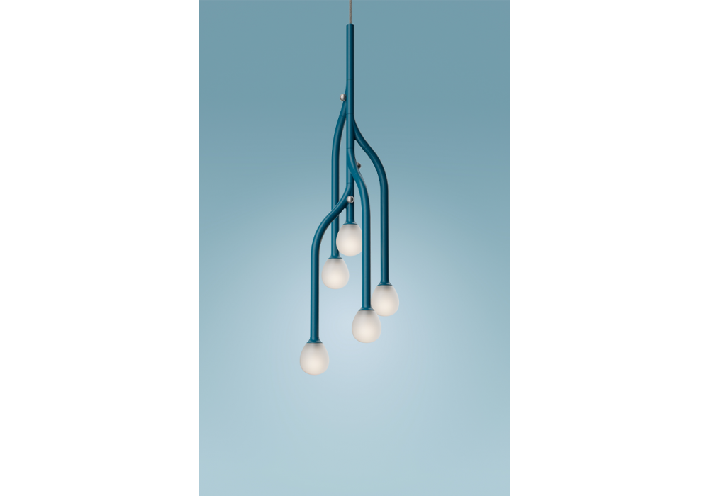 Tilia firmata da Franesca Lanzavecchia per Foscarini è una lampada a sospensione formata da una struttura in metallo dalla quale emanano bracci di diverse forme e lunghezze che culminano in diffusori in vetro borosilicato sabbiato opalino.
