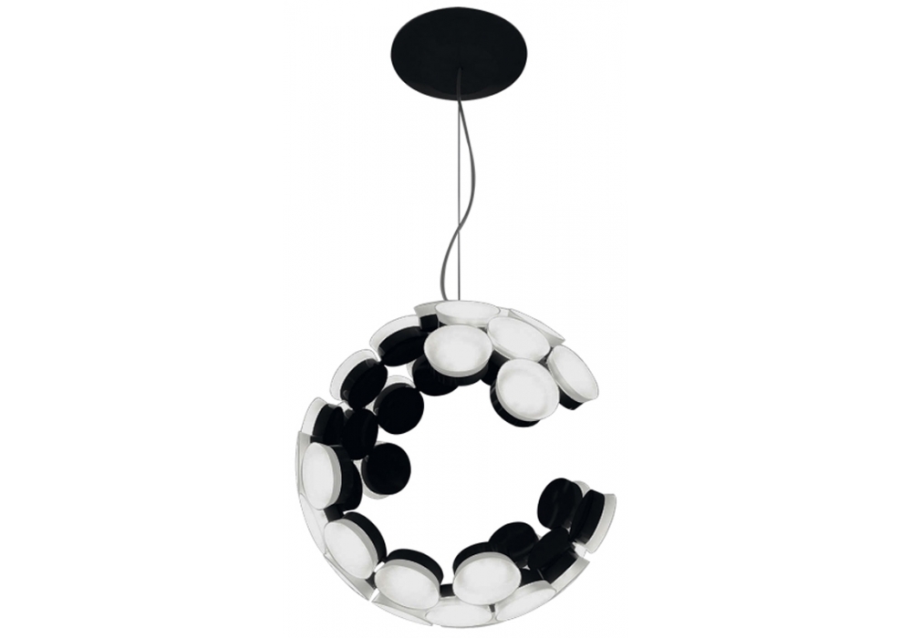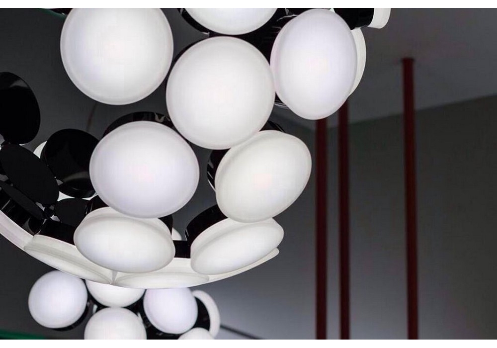 Scopas firmata Neil Poulton per Artemide è una lampada a sospensione di forma semi circolare strutturata da svariati moduli ulluminanti di forma esagonale in materiale plastico. Le sorgenti luminose adottate sono di tipo LED con sistema di dimmerabilita Push APP eseguibile da apposite apparecchiature elettroniche.