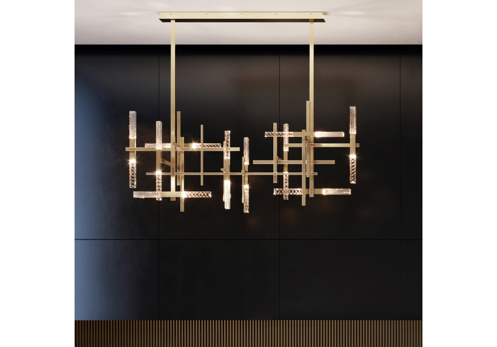 Mikado Double firmata da Massimiliano Raggi per Contardi è una lampada a sospensione con tubi rettangolari in ottone e cubi obliqui in cristallo inciso. Le sorgenti LED integrate valorizzano la brillantezza del cristallo, offrendo al tempo stesso elevate prestazioni luminose. Dimmerabile a taglio di fase (Triac), con sistemi DALI e 1–10V o CASAMBI.