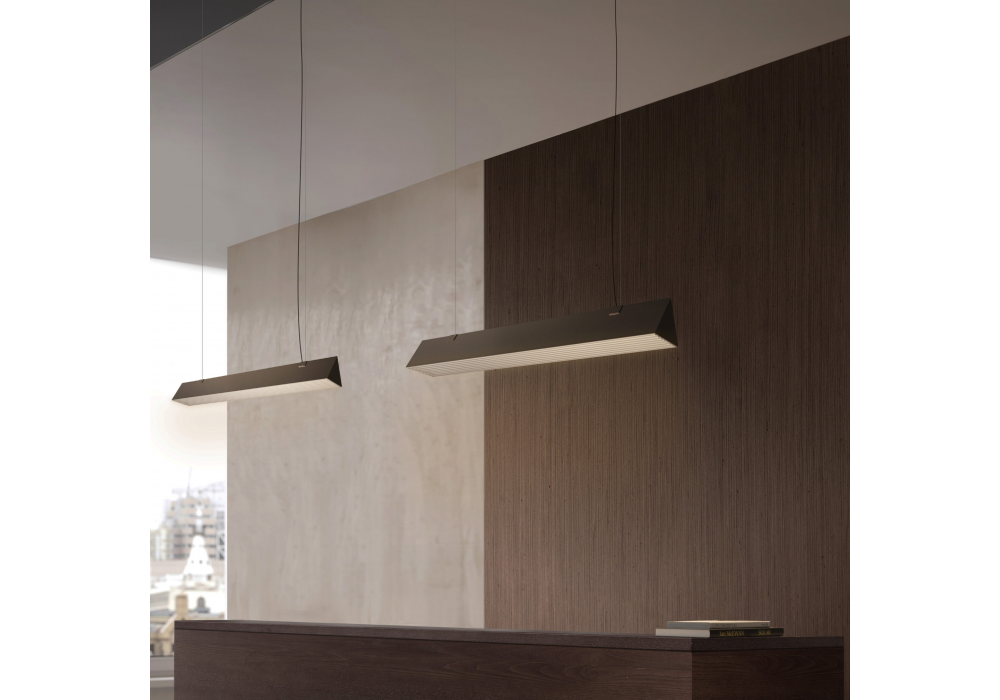 Stick firmata da Studiopepe per Contardi è una lampada a sospensione realizzata con struttura in metallo e diffusore in plexiglass rigato. Dimmerabile a taglio di fase (Triac), con sistemi DALI e 1–10V o CASAMBI.