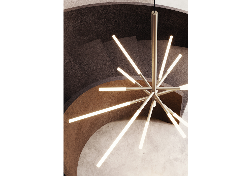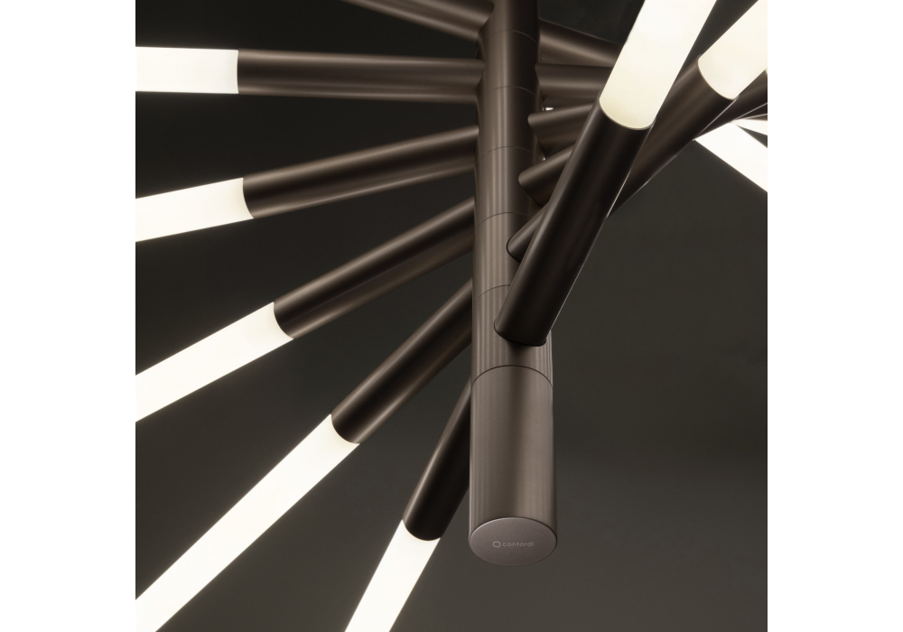 Bianca firmata da Dainelli Studio per Contardi è una lampada a sospensione caratterizzata da bracci luminosi in finitura oro o bronzo. La struttura modulare consente di orientare e personalizzare la composizione senza l’uso di cavi, grazie a un sistema di connessione a contatto. Le sorgenti tubolari in vetro bianco latte, realizzate su misura, garantiscono una luce calda e sofisticata. Dimmerabile e compatibile con diversi sistemi di controllo.
