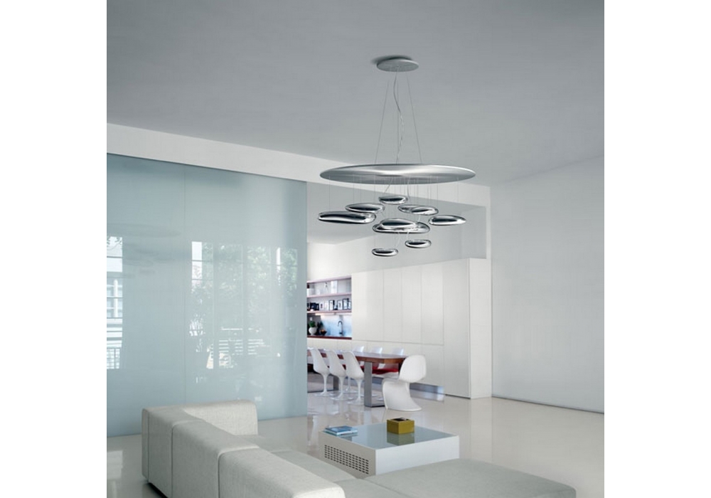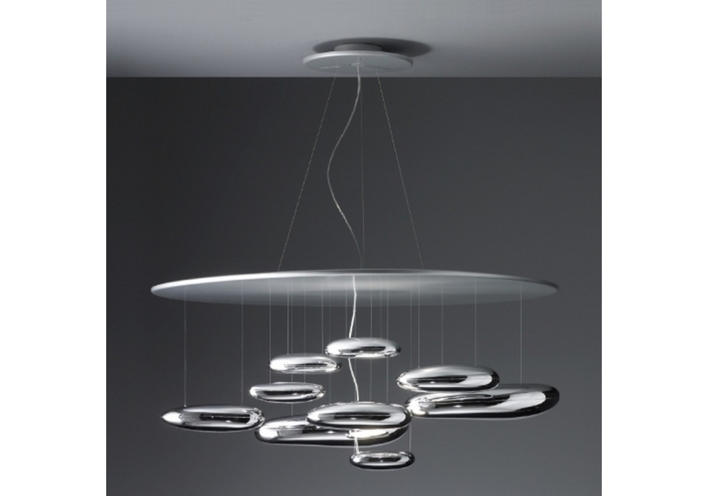 Mercury firmata da Ross Lovegrove per Artemide è una lampada a sospensione con rosone e piastra di ancoraggio circolare in alluminio. I diffusori sono dei ciottoli fluttuanti con delle fonti di luce di tipo LED con sistema di dimmerabilità Push. Mercury è disponibile in differenti versioni di sorgente luminosa.