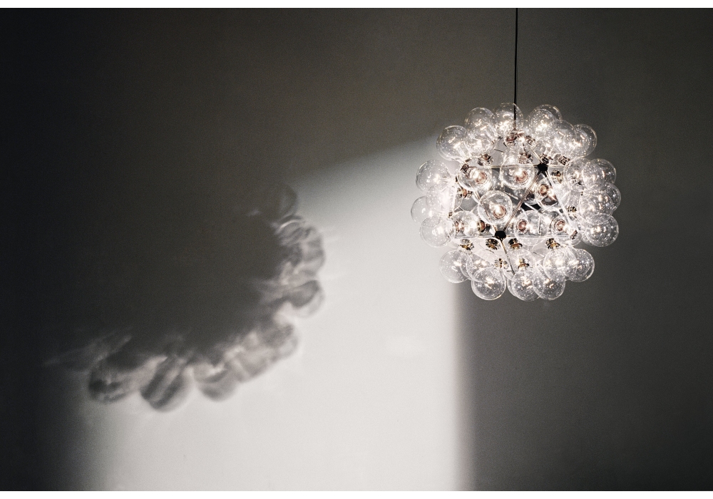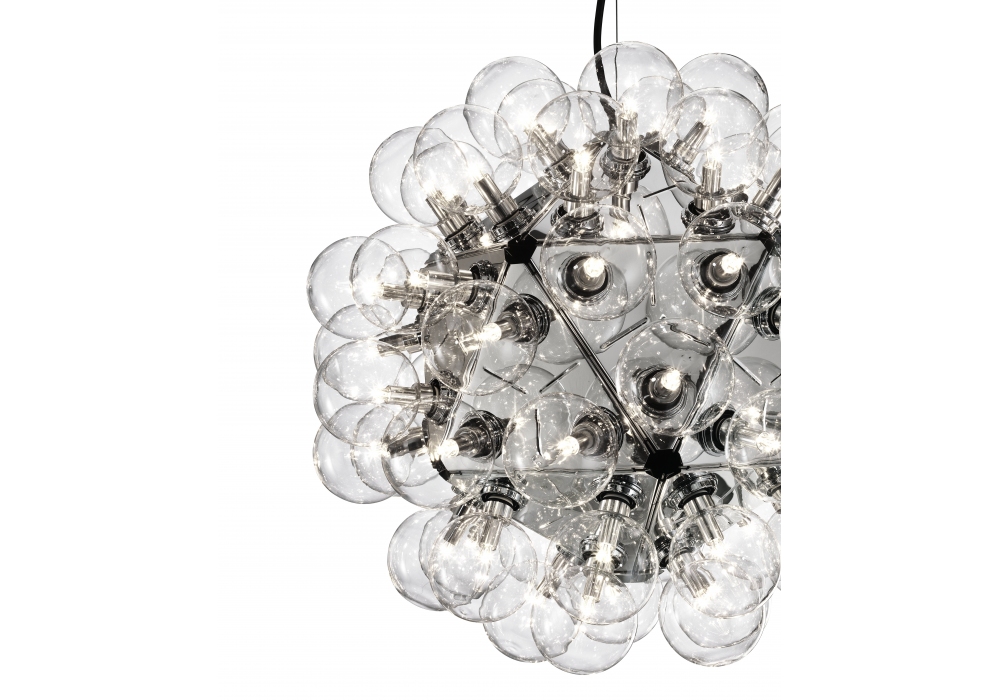 Taraxacum 88 S1 firmato da Achille & Pier Giacomo Castiglioni per Flos è un apparecchio di illuminazione a sospensione a luce diretta e riflessa. Struttura composta da 20 triangoli in alluminio lucidato stampato. 60 lampadine Globolux chiare, alloggiano attorno alla struttura. Attacco a soffitto e rosone di acciaio. Regolabile da remoto (dimmer non incluso). Lampadine incluse.