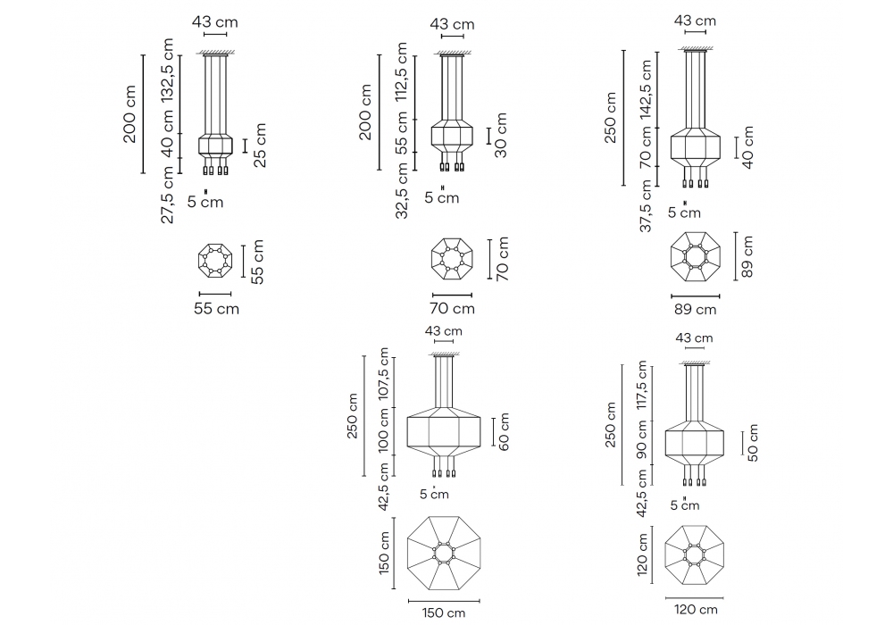 | Dimensioni | 150 x 150 x H 250 cm; 120 x 120 x H 250 cm; 89 x 89 x H 250 cm; 70 x 70 x H 200 cm; 55 x 55 x H 200 cm. |