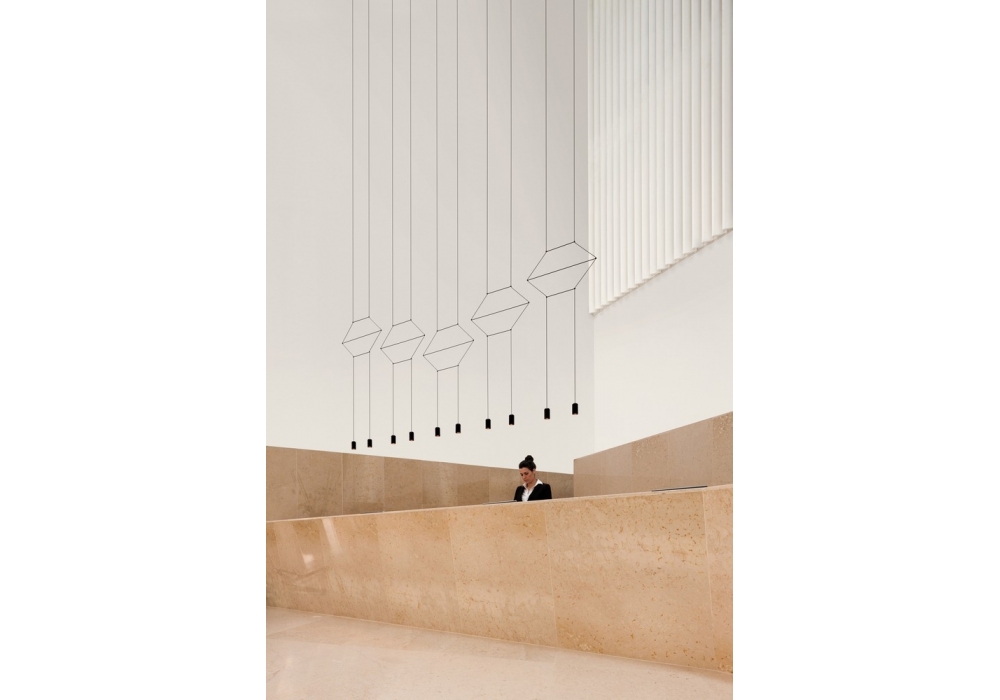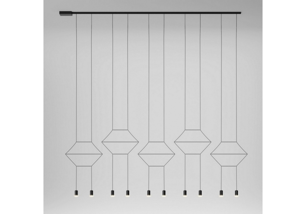 Wireflow Linear di Vibia è una lampada a sospensione con rosone quadrangolare in alluminio e struttura tubolare in acciaio verniciato di colore nero. I diffusori sono in policarbonato e schermano delle sorgenti luminose di tipo LED dimmerabili. Wireflow Linear è disponibile in differenti modelli, gradazioni di sorgenti luminose e dimmerabilità.