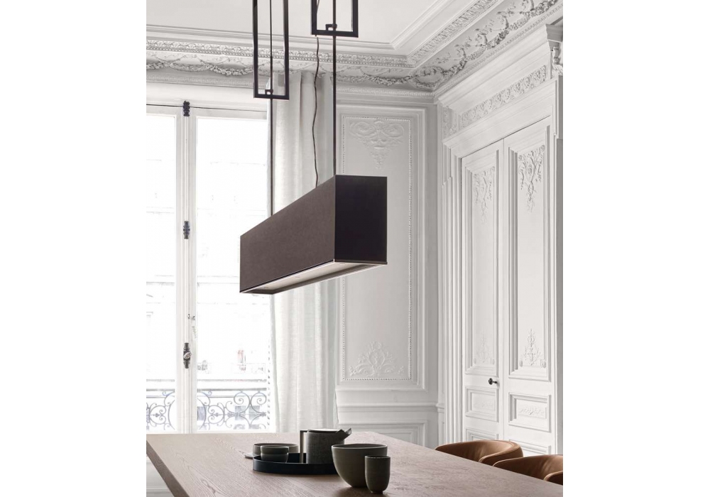 Leukon firmata da Antonio Citterio per Maxalto è una lampada a sospensione disponibile con paralume rettangolare in tessuto beige, testa di moro o bianco e schermo inferiore in vetro acidato. Le strutture sono in metallo bronzato o cromato lucido. Disponibile in due dimensioni.