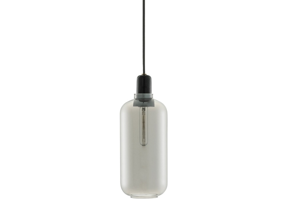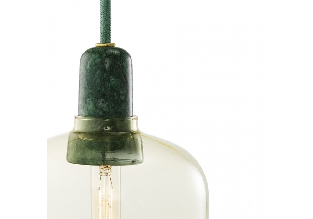 Amp firmata da Simon Legald per Normann Copenhagen è una lampada a sospensione, con cavo di sospensione innestato in un corpo centrale di sostegno in marmo, nei colori verde nero o bianco. Il paralume è di forma cilindrica in vetro, nelle finiture gold, fumè o bianco. La sorgente luminosa adottata è di tipo LED (non inclusa). Amp è disponibile in versione EU (Europa) o US (U.S.A).