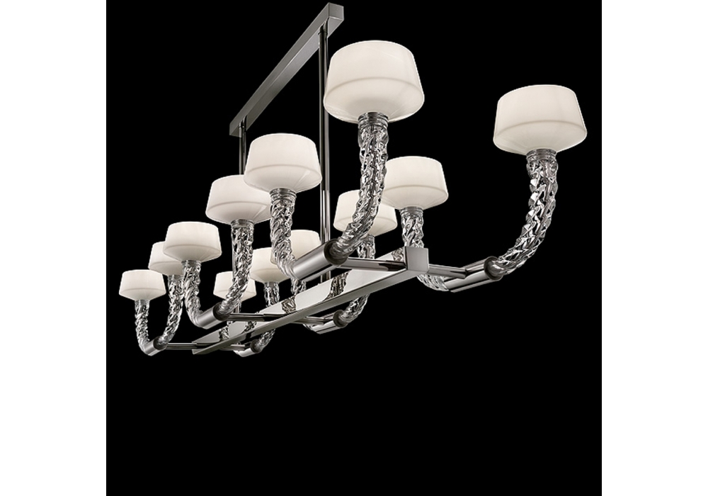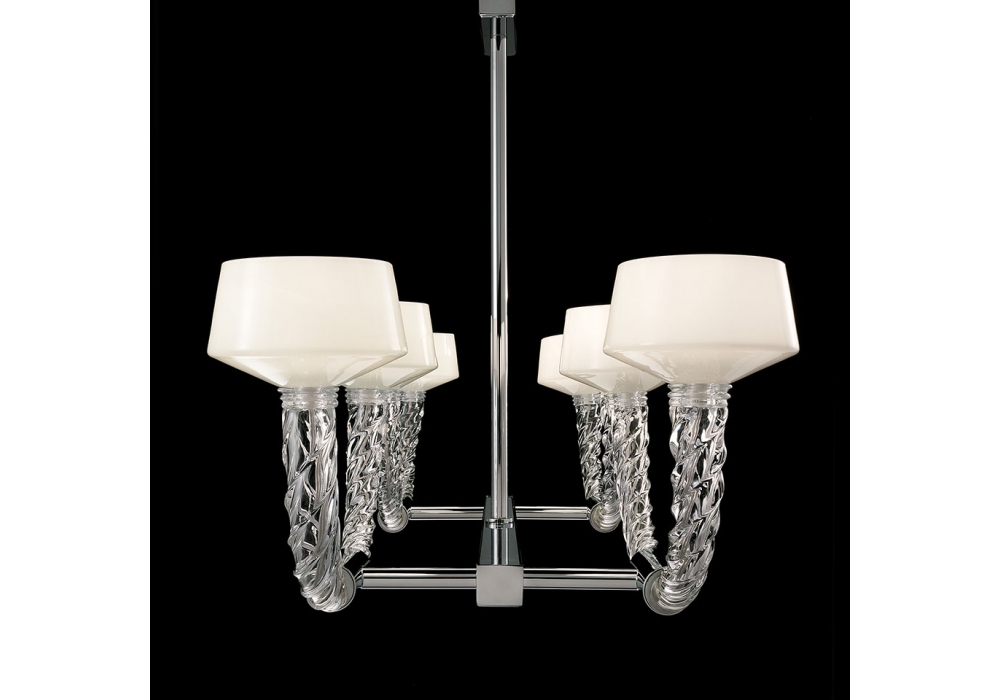 Twins prodotto e firmato da Barovier & Toso è un lampadario con struttura portante è in metallo di forma quadrangolare con bracci rivestiti in vetro veneziano. I diffusori sono di forma circolare sempre in vetro veneziano di colore bianco e schermano delle sorgenti luminose di tipo LED o alogene dimmerabili. Twins è disponibile in differenti modelli e finiture.