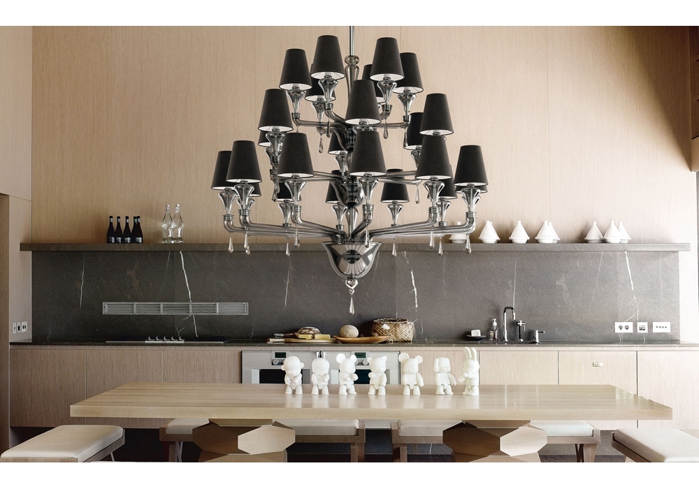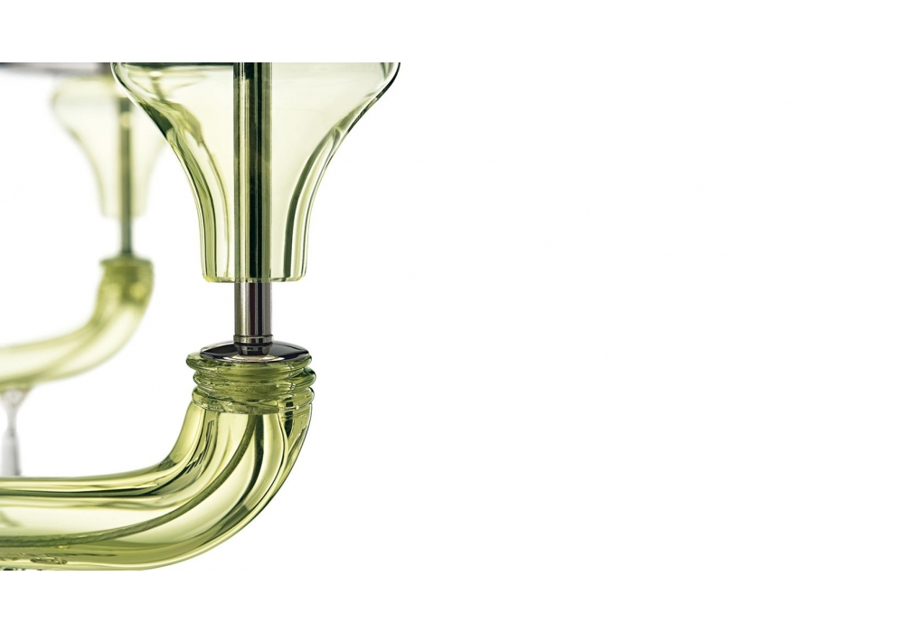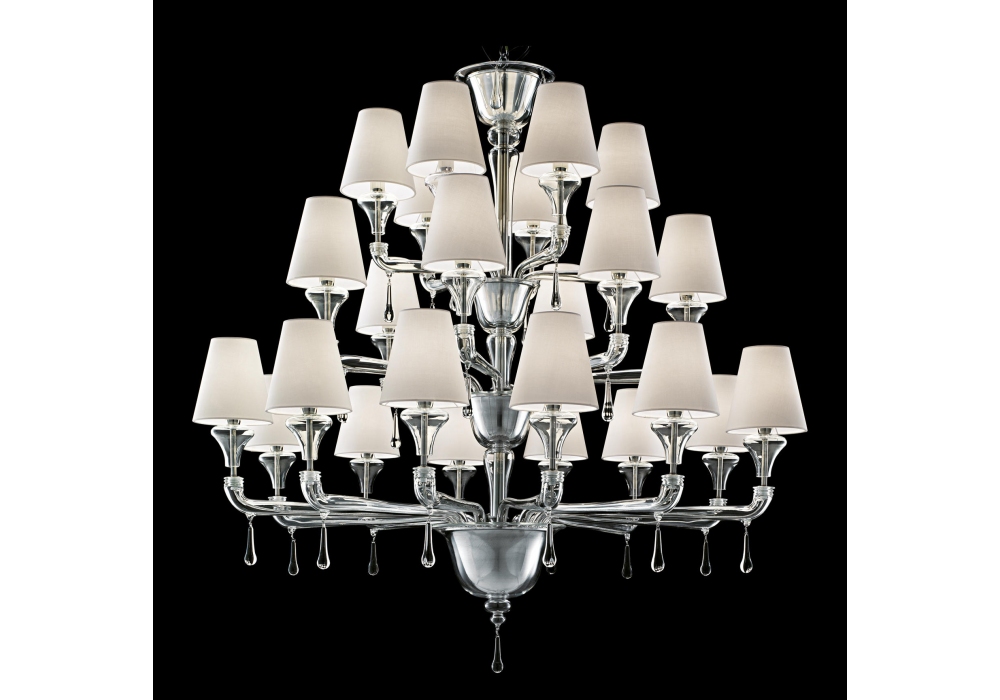 Nevada firmato e prodotto da Barovier & Toso è un lampadario strutturato a livelli sovrapposti con telaio in metallo rivestito in vetro veneziano. I bracci supportano dei paralumi in tessuto con sorgenti luminose di tipo LED o alogene dimmerabili. Nevada è disponibile in differenti modelli e finiture.