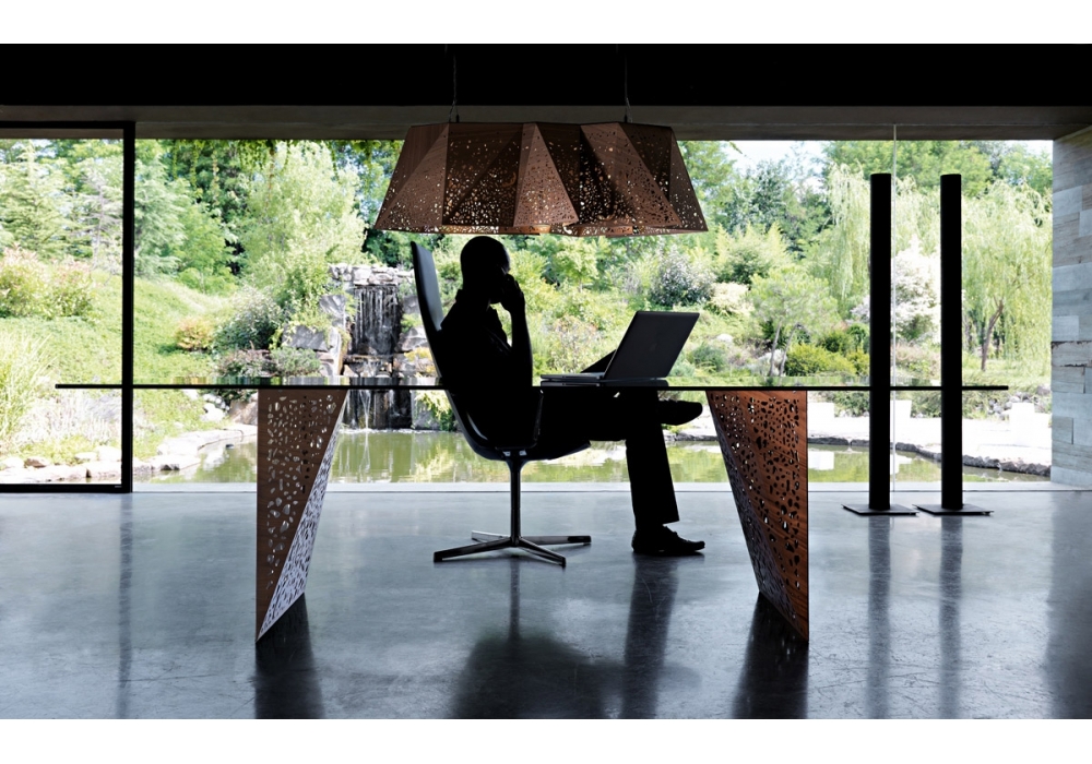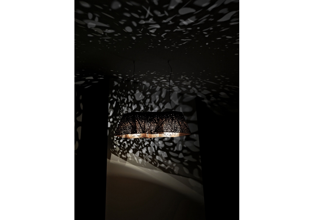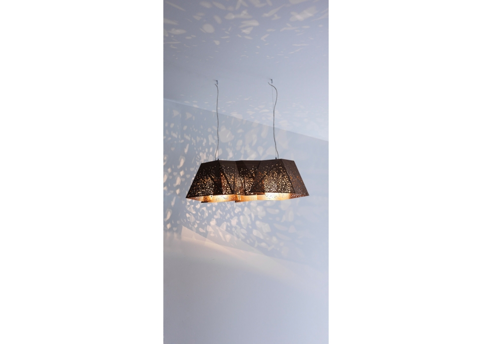 Plywood Chandelier firmata da Steven Holl per Casamania & Horm è un lampadario composto da un paralume realizzato con un materiale creato e brevettato da Horm composto da un sandwich di legno (noce canaletto) e tessuto dello spessore di 2,2 mm che, grazie a delle incisioni superficiali eseguite con taglio laser, viene piegato come un origami. Fissaggio al soffitto mediante piastra in acciaio e fili di sospensione in acciaio regolabili.