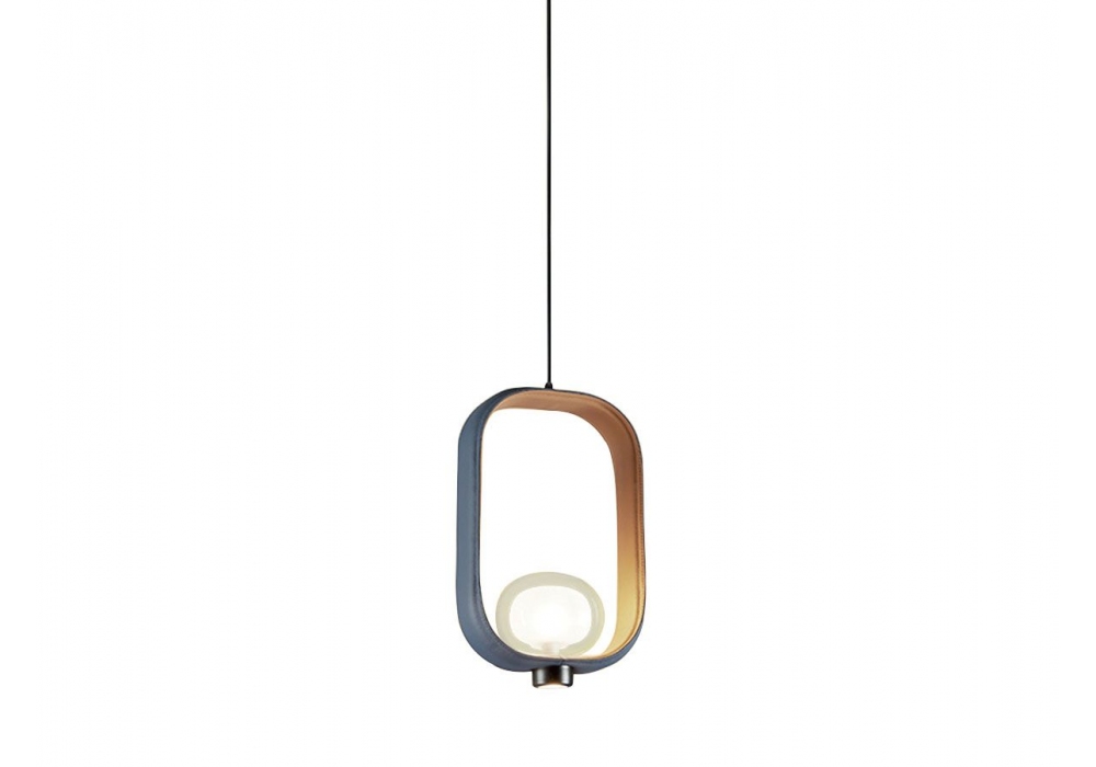 555 Filipa firmato da Corrado Dotti per Tooy è un lampadario con struttura in metallo bidimensionale, diffusore in vetro a doppia parete e sorgente luminosa a LED integrata. Una nuova versione in pelle bicolore ha arricchito la collezione. Lampadina non inclusa.