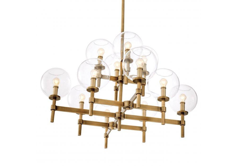 Jade firmato da Eichholtz è un lampadario realizzato con struttura in ottone antico e globi in vetro trasparente.