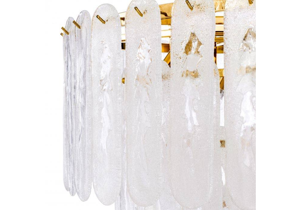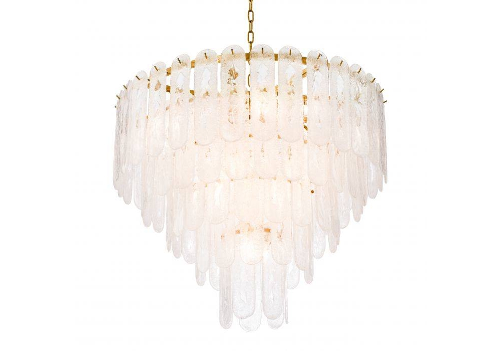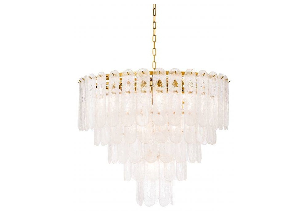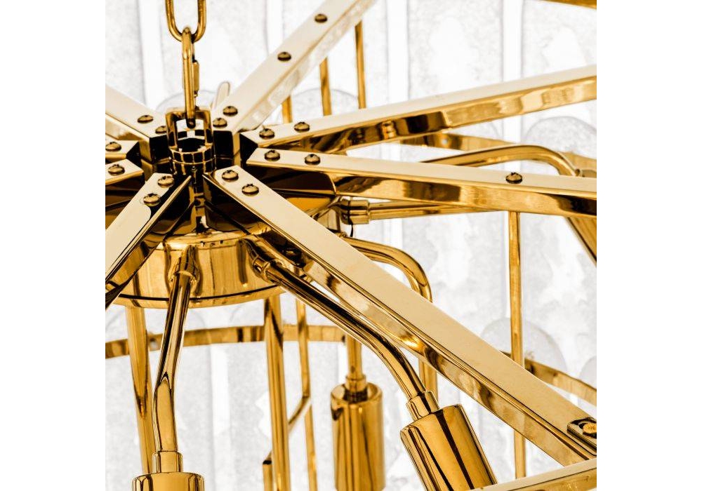 Riveria firmato da Eichholtz è un lampadario realizzato con finitura in oro e vetro smerigliato.