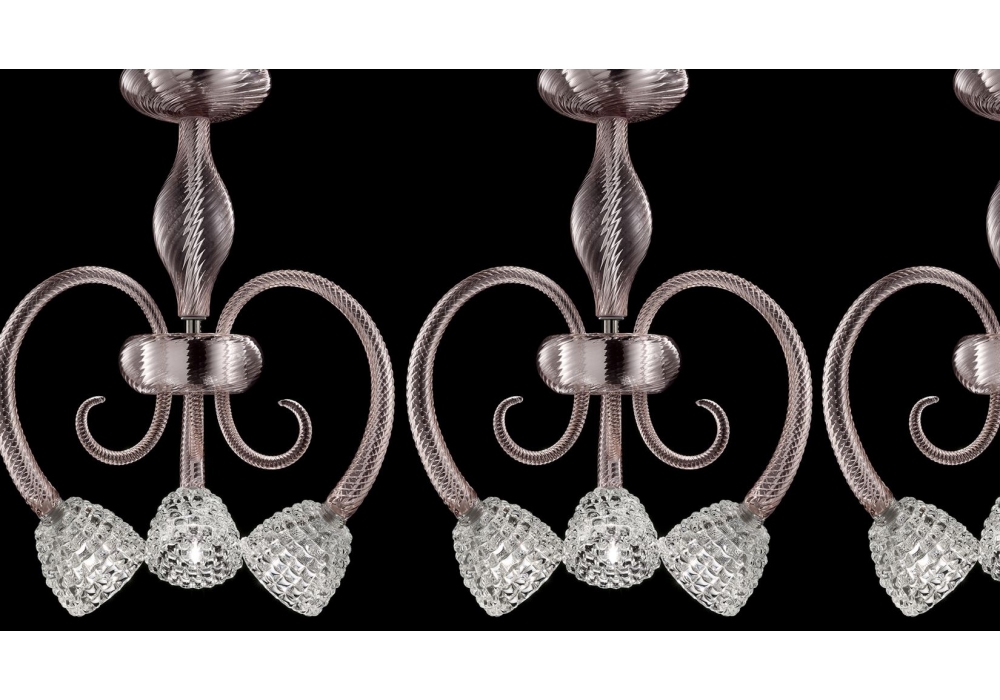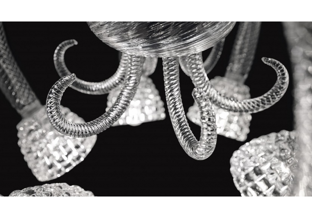 Quadri firmato e prodotto da Barovier & Toso è un lampadario strutturato a 1 o più livelli sovrapposti con telaio in metallo rivestito in vetro veneziano. I bracci ed i diffusori sono imprezziositi da piccole cupisdi che ne ricoprono l'intera superficie. Le sorgenti luminose sono di tipo LED o alogene dimmerabili. Quadri è disponibile in differenti finiture e modelli.