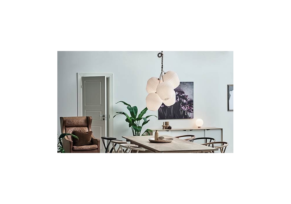 The Bouquet 7 firmata da Sinja Svarrer per Le Klint è una lampada a sospensione strutturata dalla combinazione di materiale plastico e legno. I sette grandi paralumi sono in materiale plastico o cartaceo con superficie a pieghe regolari e precise per garantire una diffusione della luce ottimale. L'alloggio della lampada è in legno di rovere ed utilizza sorgenti luminose LED o alogene (non incluse). The Bouquet 7 è disponibile in differenti dimensioni.