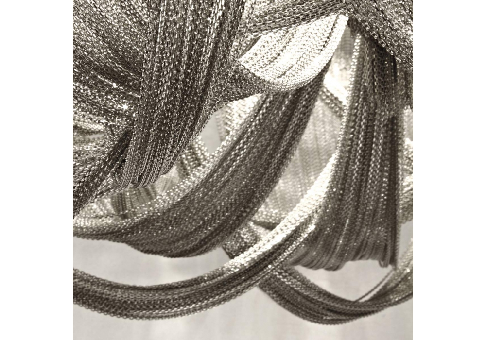 Soscik firmato da Nicolas Terzani per Terzani è un lampadario di forma circolare interamente realizzato in metallo placcato con pendenti a maglia metallica. La sorgente luminosa adottata è di tipo LED dimmerabile. Soscik è disponibile in differenti modelli e finiture.