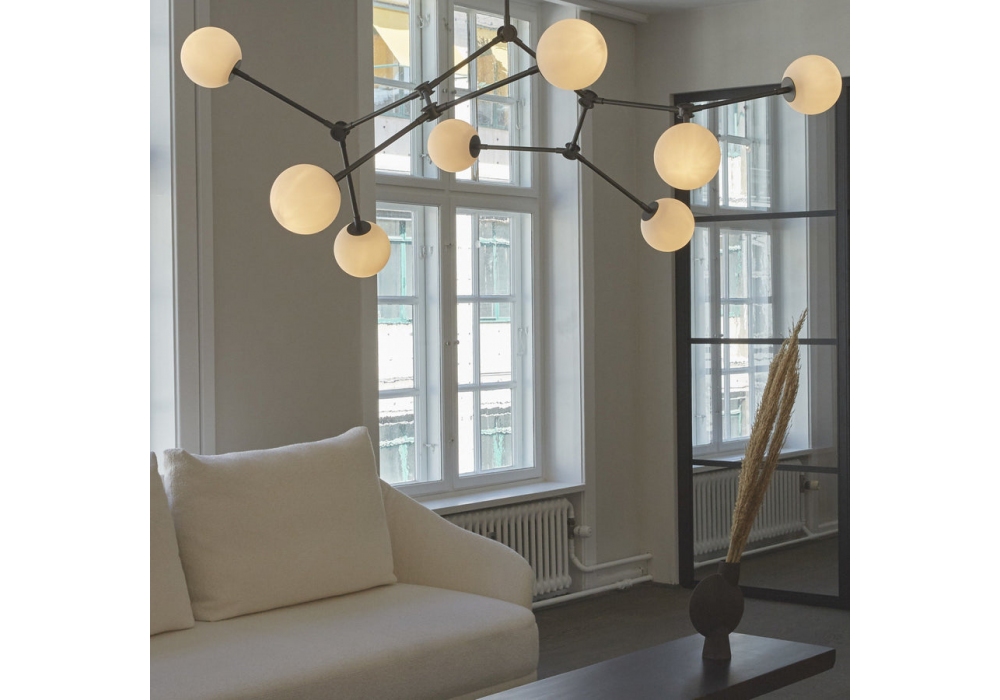 Drop Bulp firmato da Kristian Sofus Hansen & Tommy Hyldahl per 101 Copenhagen è un lampadario realizzato in metallo nella finitura grigio e paralumi in vetro opalino.