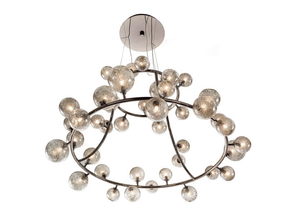 Ducale firmato da Giuseppe Iasparra per Longhi è un lampadario tondo con struttura in metallo nelle finiture galvaniche oro chiaro e nickel nero. Sfere in vetro soffiato di diverse dimensioni con inserti in oro per la struttura in oro chiaro e ottone per la versione in finitura nickel nero.