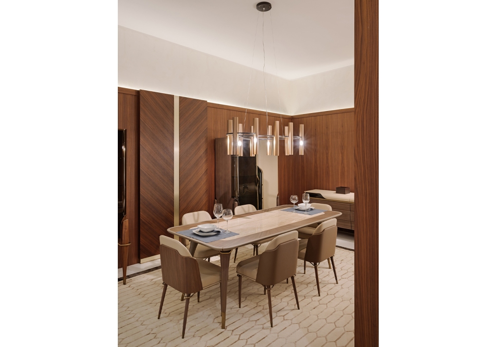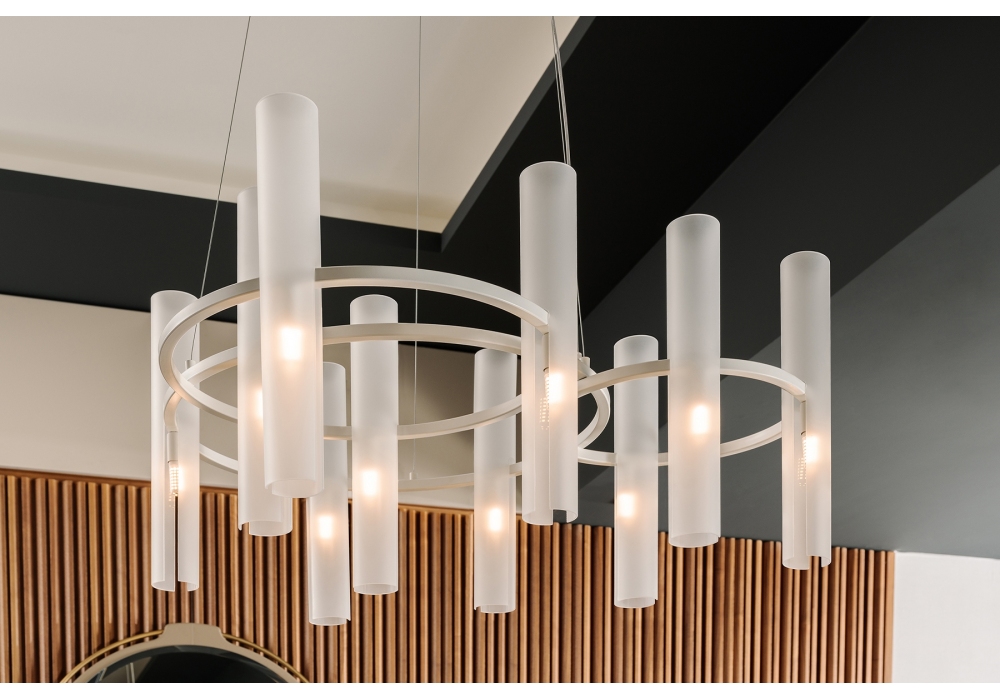 Reeds firmato da Marcello Ziliani per Turri è un lampadario costituito da tre anelli di diverso diametro che sostengono dieci tubi in alluminio per la dimensione Ø 120 x H 40 cm o in vetro acidato per Ø 80 x H 40 cm, calzati in corrispondenza delle sorgenti luminose grazie a delle fenditure laterali.