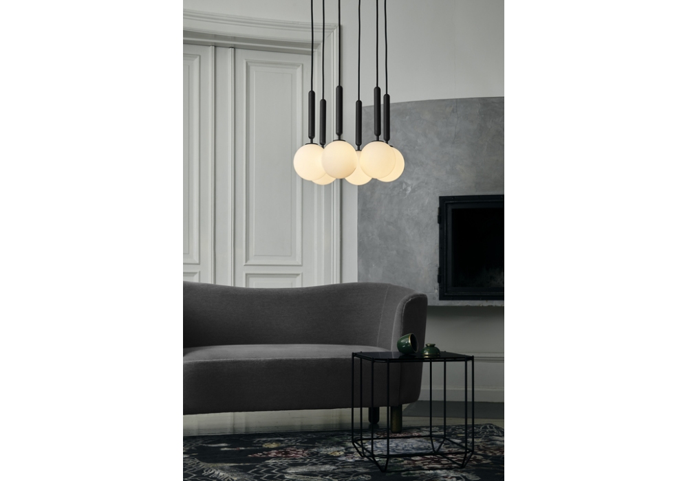 Miira firmato da Sofie Refer per Nuura è un lampadario con struttura in metallo lavorato e diffusore in vetro opale soffiato a bocca o trasparente con motivo in rilievo.