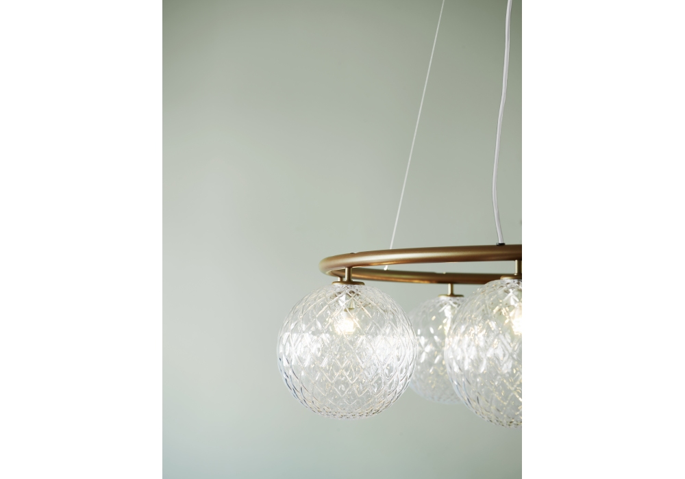 Miira Circular firmato da Sofie Refer per Nuura è un lampadario caratterizzato da un anello metallico verniciato a polvere e da diffusori sferici in vetro opalino soffiato a bocca o traspranete con motivi in rilievo.