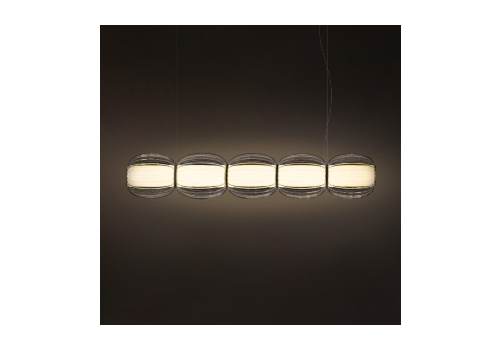 Alma firmato da Controvento per Contardi è un lampadario realizzato in vetro soffiato e diffusore in tessuto plissé. Dotata di strip LED custom, dimmerabile a taglio di fase (Triac), con opzioni DALI, 1–10V o CASAMBI.