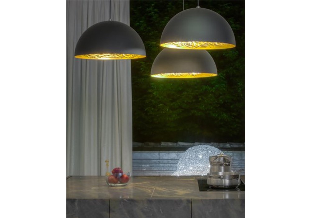 Stchu-Moon 02 Chandelier firmato da Enzo Catellani per Catellani&Smith è una lampada a sospensione a LED con tre diffusori, disponibile in diverse dimensioni. Ogni diffusore è una semisfera in alluminio con superficie interna irregolare rivestitia in foglia, in vari colori. L'esterno del diffusore è nero opaco. Il cucchiaio porta lampada, che contiene ogni lampadina, è in metallo.
