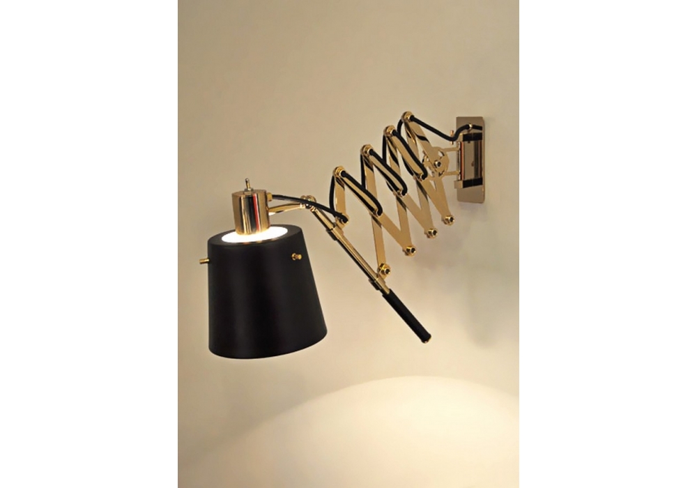 Pastorius firmata da DelightFULL è una lampada da parete con un braccio estensibile che può essere regolato in diverse posizioni. La sua struttura è realizzata in ottone e il paralume in alluminio.