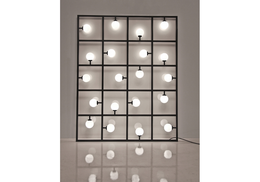 Squares è una lampada da parete o da terra prodotta da Atelier Areti, realizzata in metallo, con sfere in vetro. Squares non è solo una lamapada ma soprattutto una scultura di luce, creata per essere appoggiata semplicemente contro un muro, oppure può essere montata a parete, creando una parete luminosa. Squares è una lampada composta da 20 sfere di vetro soffiato ognuno con lampadina 2W bianco caldo LED, la struttura è disponibile in bianco o nero. Lampade incluse.
