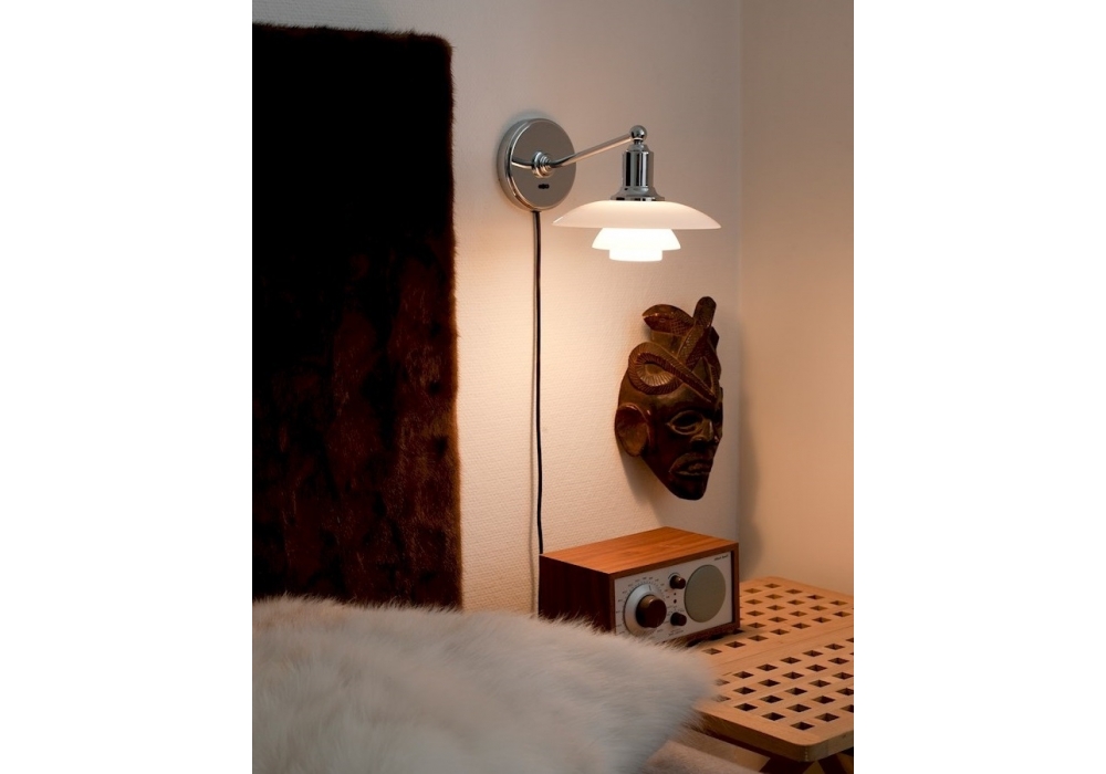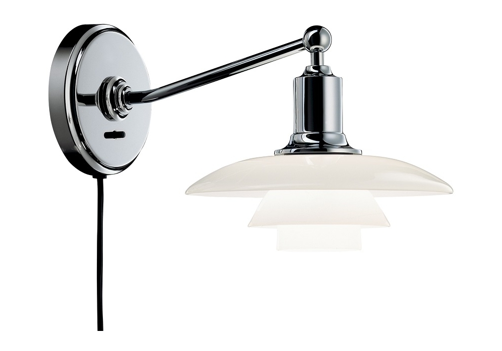 PH 2/1 firmata da Poul Henningsen per Louis Poulsen è una lampada da parete con struttura portante in ottone ed alluminio tirato e cromato. Il diffusore è in vetro bianco opalino e scherma una sorgente luminosa con innesto E14 di tipo LED o alogeno con differenti opzioni di controllo.