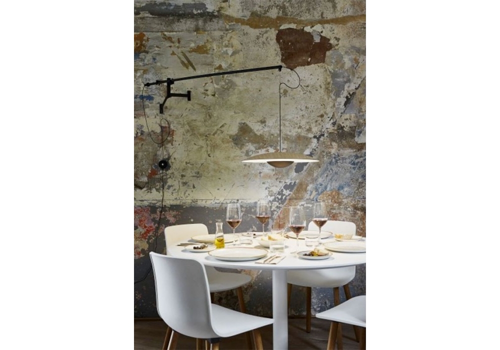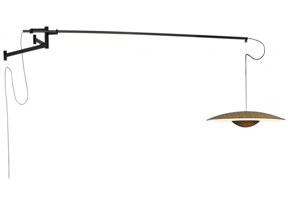 Ginger A XL firmata da Joan Gaspar per Marset è una lampada da parete con diffusore in legno pressato di 4 mm in rovere naturale o wengé. Diffusore in alluminio laccato nero opaco. Braccio semovibile in fibra di carbonio, laccato nero opaco.
