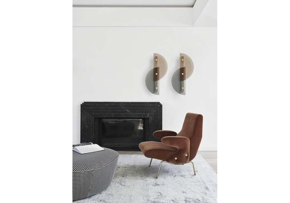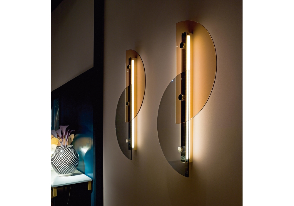 Papillon firmata da Bernhardt & Vella per Arflex è una lampada composto da due vetri temperati di forma semicircolare. Struttura in metallo dorato. Disponibile in due modelli abbinamenti di colore predefiniti: rosa e grigio o azzurro e bronzo.
