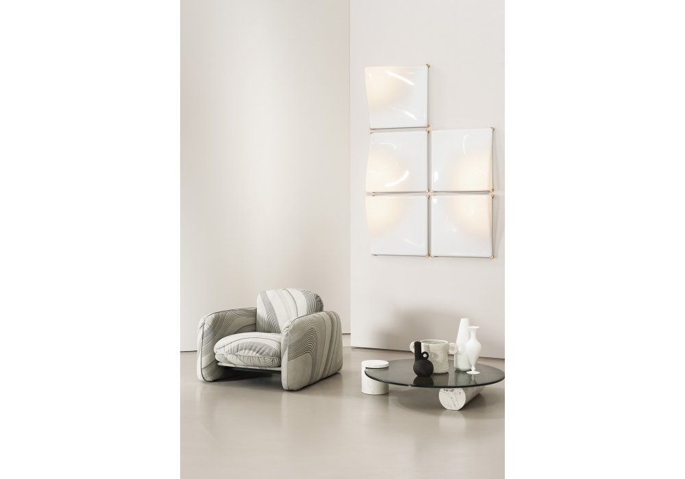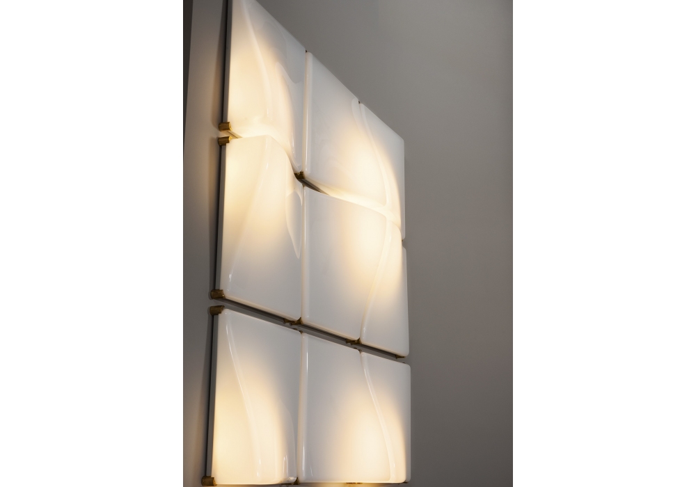 Googie firmata da Draga&Aurel per Baxter è una lampada da parete/soffitto componibile, con paralume bianco in opale stampato. Giunti e dettagli ottonati satinati con vernice opaca.