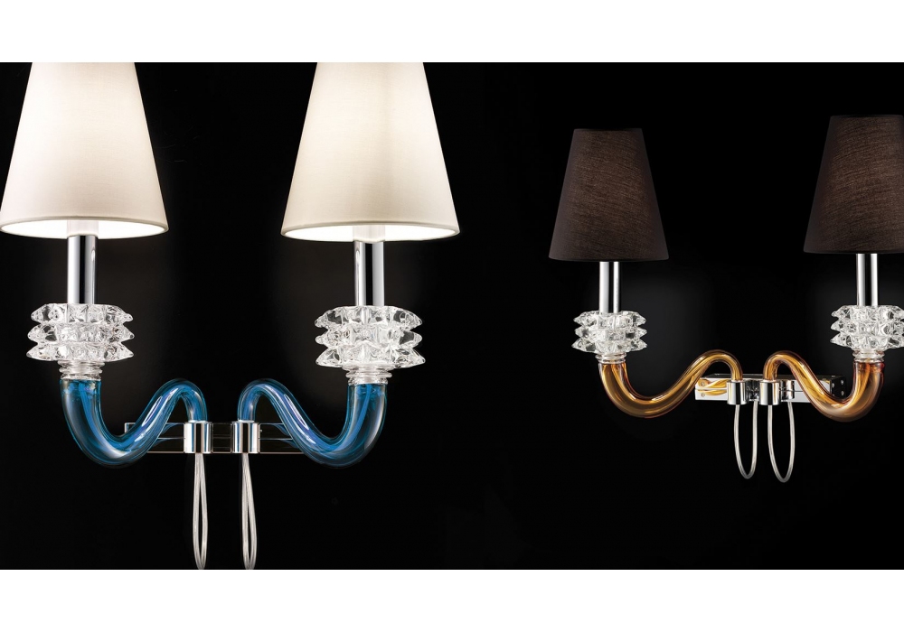 Domo Amsterdam firmata da Franco Raggi per Barovier & Toso è una lampada da parete con struttura portante in metallo con particolari color oro galvanizzato, cromo lucido o cromo nero. I bracci ed il corpo lampada sono rivestiti in vetro veneziano con ornamenti in cristallo. I paralumi sono in tessuto e schermano delle sorgenti luminose di tipo LED o alogene dimmerabili. Domo Amsterdam è disponibile in differenti finiture e modelli.