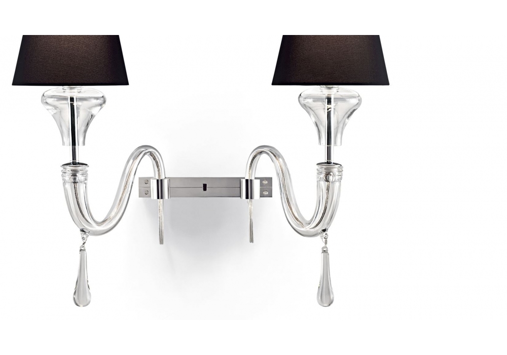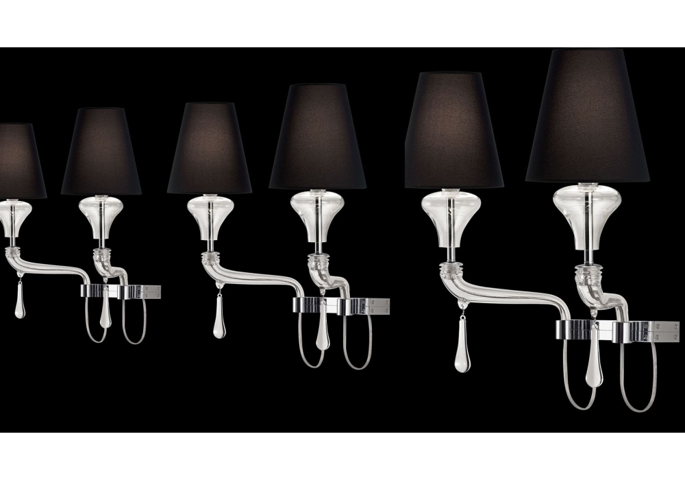 Domo Nevada firmata da Franco Raggi per Barovier & Toso è una lampada da parete con struttura portante in metallo con particolari color oro galvanizzato, cromo lucido o cromo nero. I bracci ed il corpo lampada sono rivestiti in vetro veneziano con pendenti in cristallo. I paralumi sono in tessuto e schermano delle sorgenti luminose di tipo LED o alogene dimmerabili. Domo Nevada è disponibile in differenti finiture e modelli.
