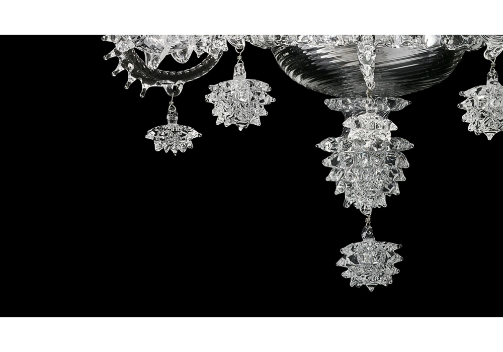 Venezia 1295 firmata e prodotta da Barovier & Toso è una lampada da parete con struttura portante e particolari in metallo color oro galvanizzato o cromo lucido. I bracci ed il corpo lampada sono rivestiti in vetro veneziano color cristallo con pendenti e decorazioni sempre in cristallo. Le sorgenti luminose adottate sono di tipo LED dimmerabili.