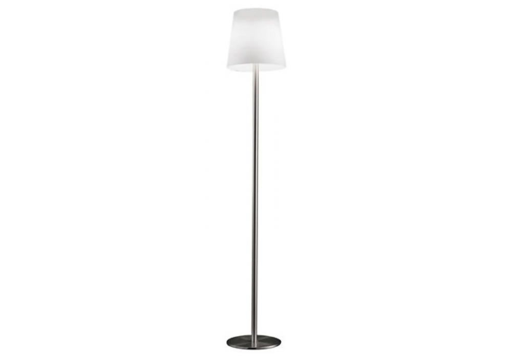 Naxos firmata e prodotta da Vistosi è una lampada da terra con base circolare ed asta verticale in metallo color nichel. Il diffusore di forma circolare è in vetro bianco satinato ed adotta una sorgente luminosa con innesto E27 di tipo LED o alogena.